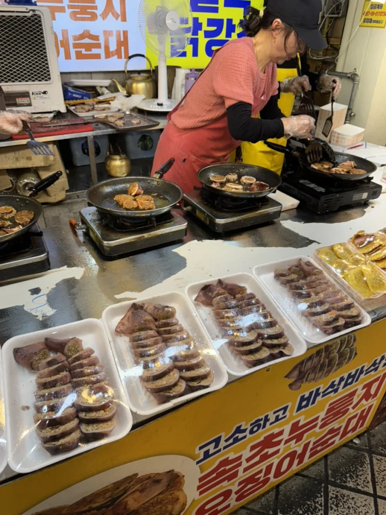 絶対に外せないのが、束草名物の「オジンオスンデ(イカ飯)」。イカの胴体にもち米や野菜、刻んだイカの足などを詰めて蒸した郷土料理で、北朝鮮にルーツを持つと言われています。輪切りにして卵の衣で焼いたものを頬張れば、素朴ながらも奥深い味わいが口いっぱいに広がります。