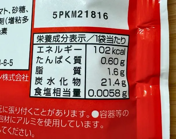 - 栄養成分: エネルギー 102kcal、たんぱく質 0.60g、脂質 1.6g、炭水化物 214g、食塩相当量 0.055g (1袋あたり)