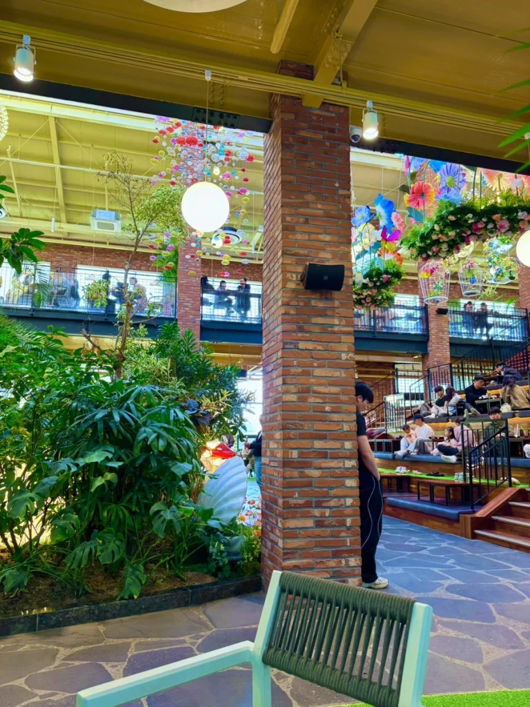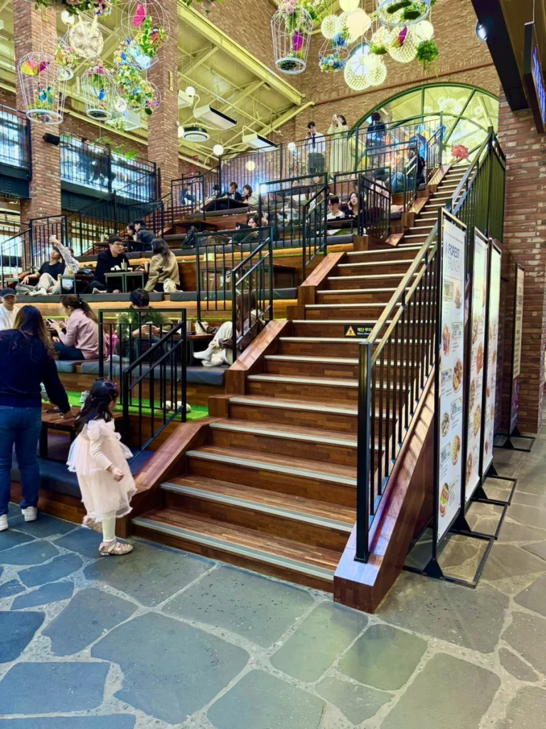 私が訪れたのは京畿道(キョンギド)の一山(イルサン)ですが、驚いたのはそのスケール感。高い天井まで届く吹き抜けの空間に、太陽の光がさんさんと降り注ぎ、信じられないほどの開放感です。中央には小さな池や小川が流れ、水のせせらぎが聞こえてきます。これはもうカフェというより、ひとつの建築作品のようでした。