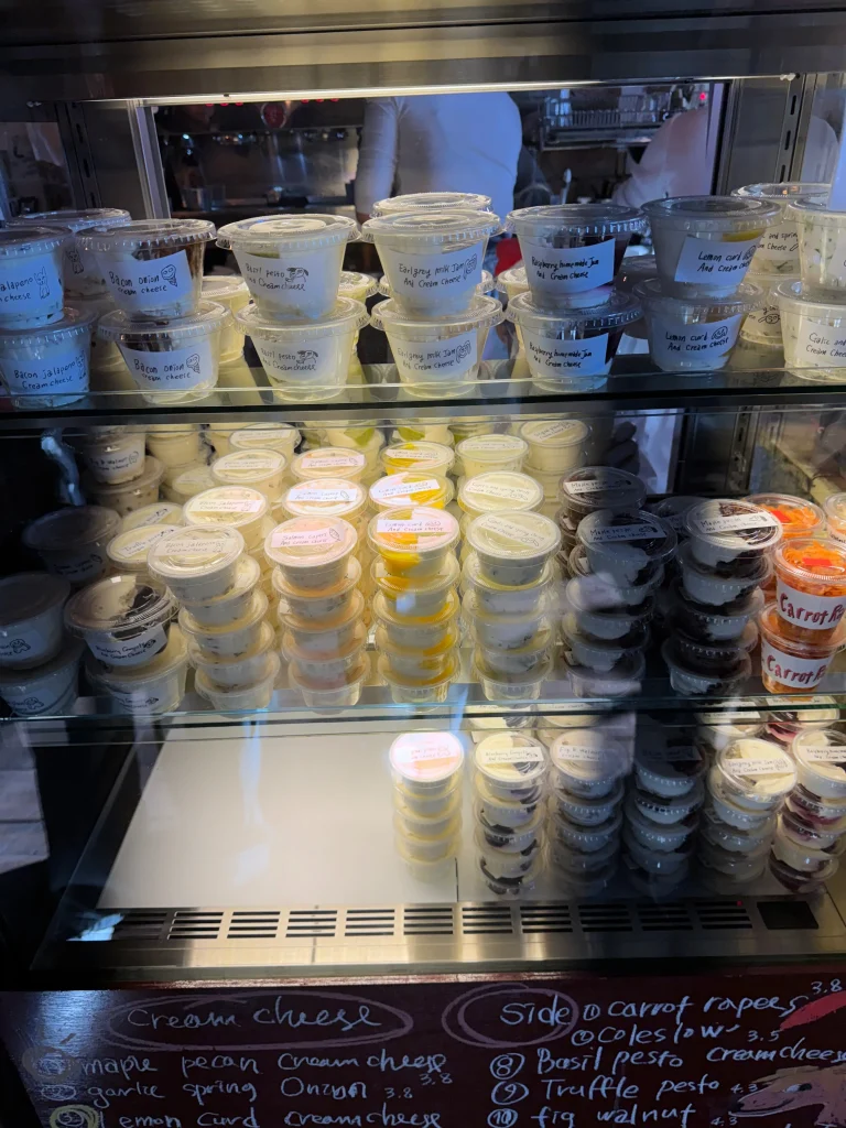 ロンドンベーグルミュージアムのもう一つの主役が、豊富な種類のクリームチーズ。ベーグルだけでなく、このクリームチーズを目当てに来る人も多いのだとか。定番のプレーンから、「メープルピーカン」や「ガーリック&スプリングオニオン」といった変わり種まで、ショーケースは宝石箱のよう。