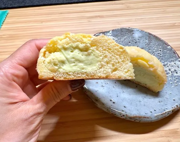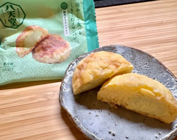 思い切って一口。まず、クッキー生地の「サクッ!」という音が頭の中に響きます。この音だけで、もう美味しい。そして、その直後にやってくるのが、ふんわりしっとりしたパン生地と、中からあふれ出すひんやりとしたメロンクリームです。