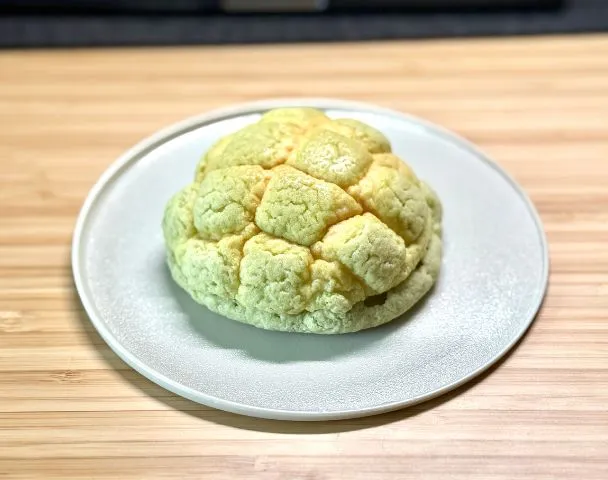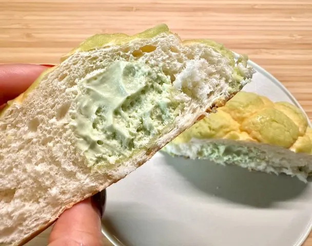 そして、パンを割ってみると中から現れるのが、淡い緑色のホイップクリーム。これが、このパンの主役です。口に入れると、想像以上にしっかりとした甘さがガツンとやってきます。しかし、ただ甘いだけではありません。クラウンメロンのピューレが使われているだけあって、フルーティーな風味が後から追いかけてきて、濃厚ながらも爽やかさを残してくれます。パン生地自体はふんわりと弾力があり、甘いクリームと香ばしいビスケット生地を優しくまとめていました。