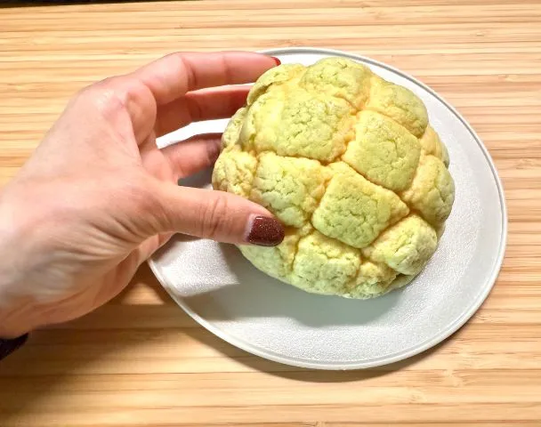 見た目は、網目がくっきりとした王道のメロンパン。表面のビスケット生地は、レビューサイトの口コミでは「サクサクとした心地よい食感」と見受けたのですが、筆者個人的にはサクサクというより、”しっとり感”の方が強い印象でした。(筆者が食べたのが賞味期限間近だったからなのだろうか。。)メロンパンでもしっとり系生地が好きな方は絶対好きですね!