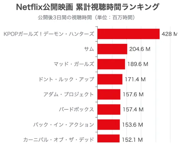 Netflix配信の映画「KPOPガールズ!デーモン・ハンターズ」は、K-POPアイドルが悪霊退治の使命を引き受けるというユニークなストーリーを持つ音楽アクション映画である。主要キャラクターはK-POPボーイズグループ「バーニング」のメンバーで、実際の韓国の人気アイドル(エンハイプン・リーシン、ニシムラマキ、ヘンリーロー)が声優を務めている。2025年にNetflixで公開された本作は、リリース後直ちに世界的な話題を呼び、配信開始後3日間で約4,280万時間もの視聴を記録し、Netflix公開作として歴代最大級のヒットとなった。[netflix.com]その人気は以下の図が示すように、Netflixの過去のヒット作品と比較しても際立っている。