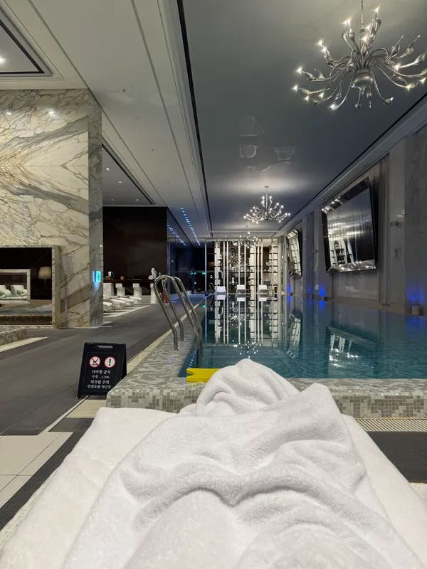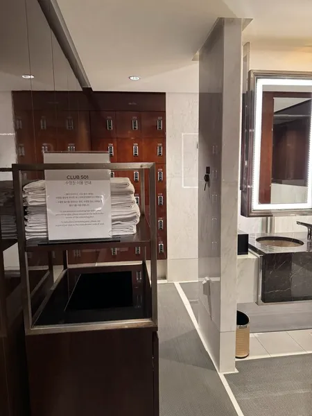 事前にネットで調べたところ、「宿泊者は無料」「時間制限で無料」といった情報が混在していて、一体どちらが本当なのか気になっていました。結論から言うと、2025年9月現在、宿泊者でも有料(1人55,000ウォン)でした。これは「知っておくべき重要なポイント」だと思います。受付は「CLUB 501」というフィットネスクラブのカウンターで行い、料金は部屋付けにできます。