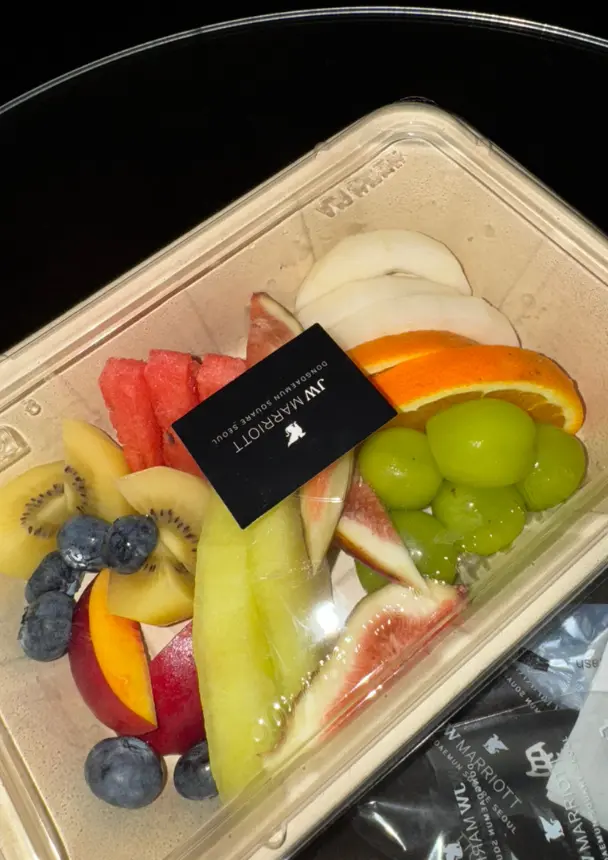 夜中に小腹が空いたので、ルームサービスでフルーツ(35,000ウォン)を注文してみました。すると、なんと配送ロボットが部屋まで届けてくれるシステムだったようです。私たちはそれに気づかず…(笑)。フロントに電話したところ、スタッフの方が保管してくれていたフルーツを、テイクアウト用の容器に入れて改めて届けてくれました。