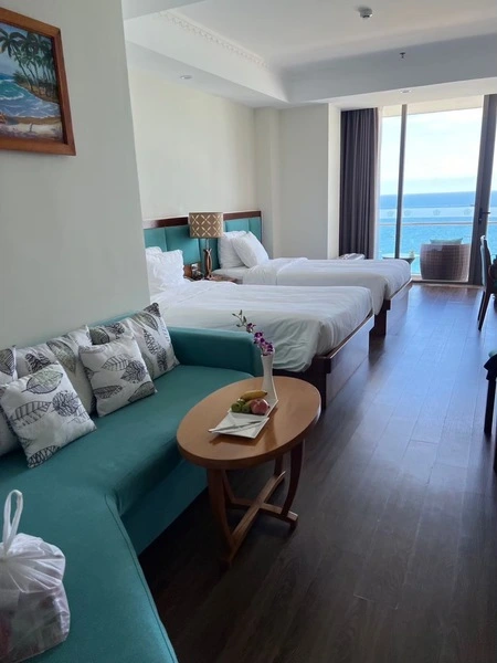 今回私たちが宿泊したのは「プレミアツインオーシャンビューバルコニー&バスタブ」というお部屋。名前の通り、バルコニーとバスタブが付いているのが特徴です。部屋の扉を開けた瞬間、思わず「わぁ!」と声が漏れてしまいました。窓一面に広がるのは、どこまでも青い空とミーケビーチの水平線。この景色を見るためだけでも、この部屋を選んで本当に良かったと感じました。バルコニーに出て潮風を感じながら、刻一刻と変わる海の表情を眺める時間は、何よりの贅沢でした。
