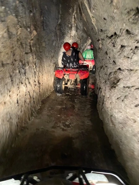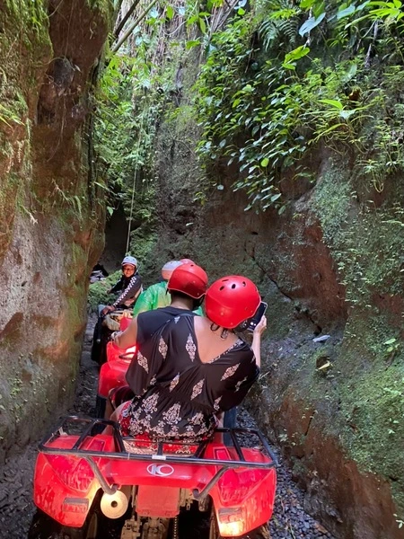 バリでは「トンネル・滝・水田・ジャングル」という独創的なコースで有名なATV(全地形対応車)ツアーを提供しており、「バリで最高のATVライド体験」と称賛されています!約1.5~2時間のツアーで、700mほどの長い天然トンネルや滝の前を走り抜けるパス、水田や川、ジャングルを走破する100%オフロードの専用コースが楽しめます。他社は一般道を走るケースもありますが、Kuber BALIはほぼ全域がオフロードのため安全でスリリングな体験が得られます。コース全体で約7~8kmを走行し、初心者でも乗れる自動変速のATVを使います。なお、安全のためヘルメットや長靴の着用が義務付けられており、ガイドが安全ブリーフィングと練習を行ってから本番コースに乗り入れます。