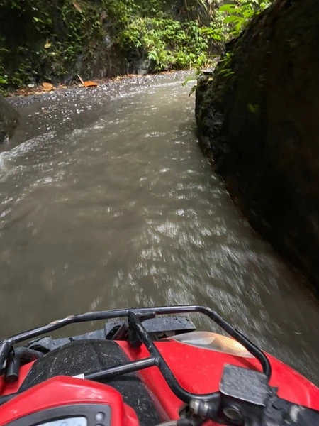 トンネルはかなり長く(約700m)、暗闇の中をATVで突っ走る刺激は絶大でした。トンネルから出ると一転して緑豊かな水田の景色が広がり、その畔道を走行することでバリの田園風景を感じることができます。続いては川の中や滝の前を走り抜けるコースがあり、ATVで水しぶきを上げながら前進する体験はとても爽快でした。コースには泥だらけの沼地を進む部分や、急な坂道を登る部分など過酷なロードも含まれており、ドキドキしながら乗りこなすスリルが味わえます。狭い道を通る部分もあり、時には速度を落として慎重に進む必要がありましたが、その分チャレンジングでした。