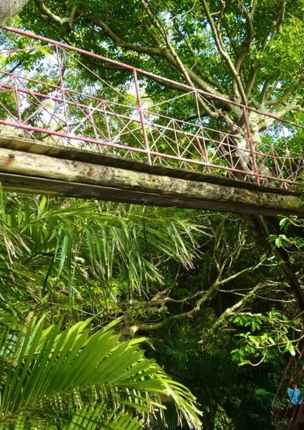 園内は、まさに探検そのもの。順路に沿って歩くと、頭上を色鮮やかなインコが飛び交い、足元には南国の花々が咲き誇ります。特に興奮したのは、園内に架かるスリル満点のつり橋。揺れる橋を渡りながら見下ろす景色は、まるで冒険映画の主人公になった気分でした。