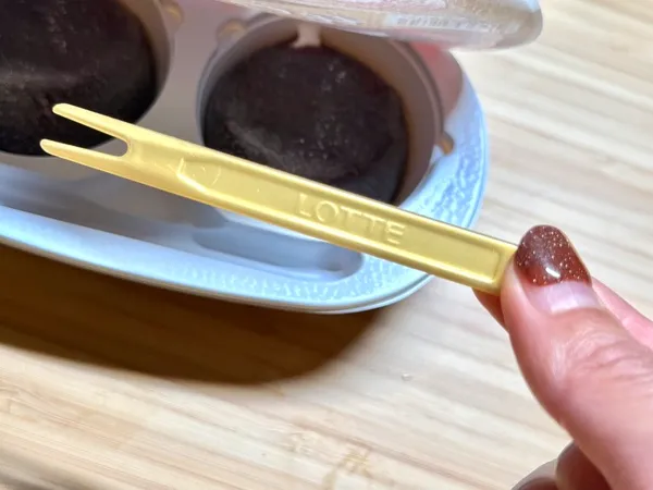 パッケージを開けると、雪見だいふくでおなじみの白いトレーに、深い小豆色のアイスが2つ、ちょこんと鎮座しています。付属のフォークは普段のピンクではなくゴールデンのフォーク。