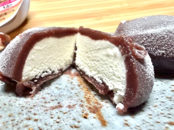 見た目はまさにお茶請けに出てくる「あんころ餅」や、伊勢名物「赤福」のよう。冷凍庫から出したばかりだと、表面がつややかに光り、まるで和菓子職人が丹精込めて作った上生菓子のような美しさです。