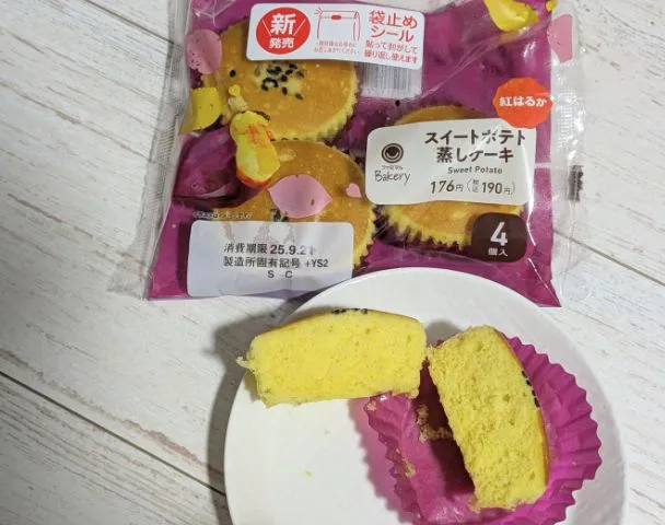 袋を開けてみても、意外なことに強いお芋の香りはしません。しかし、ケーキを一つ取り出し、半分に割ってみると…ふわっと優しい甘い香りが立ち上りました!この瞬間に期待が高まります。