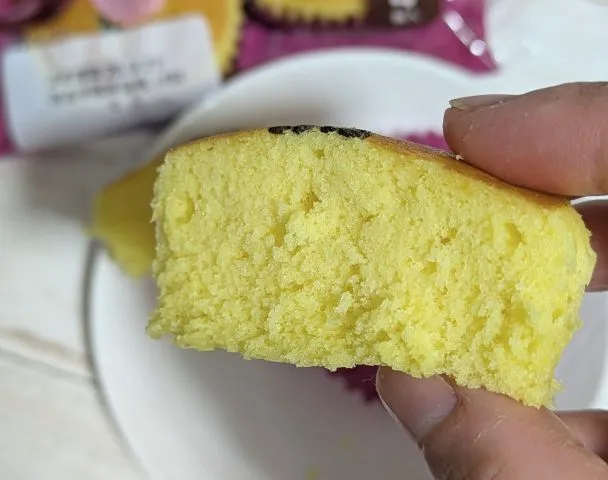肝心の「お芋感」ですが、正直に言うと「控えめで優しい」という印象です。ガツンと来る濃厚なスイートポテトの味ではなく、あくまで「スイートポテト風味の蒸しケーキ」という表現がしっくりきます。紅はるかの上品な甘さが、生地にじんわりと溶け込んでいる感じですね。
