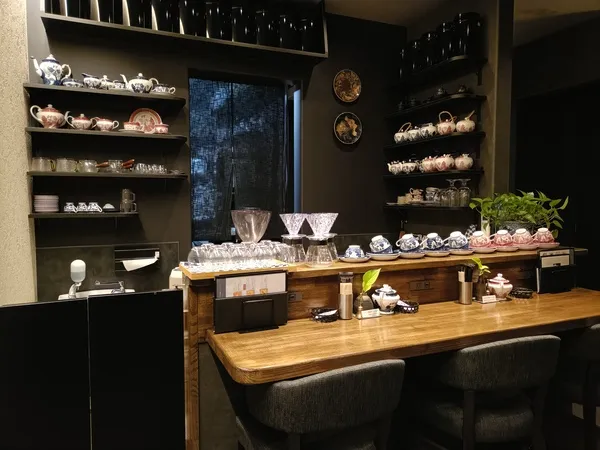 扉を開けると、まず目に飛び込んでくるのは、カウンターにずらりと並んだ美しいカップの数々。ダークな色調で統一された店内は、大きな窓から差し込む自然光と神田川の緑が映え、まるで一枚の絵画のよう。写真映えする、と聞いていましたが、実際にその場に立つと、シャッターを切るのを忘れて見入ってしまうほどの静謐な美しさがありました。