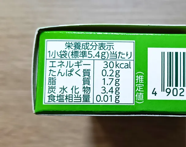 栄養成分 (1小袋 標準5.4g 当たり) | エネルギー: 30kcal, たんぱく質: 0.2g, 脂質: 1.7g, 炭水化物: 3.4g, 食塩相当量: 0.01g (推定値) |