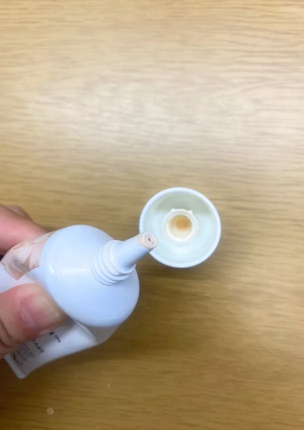 「日焼け止めジェル」という名前ですが、テクスチャーは乳液とクリームの中間のような、なめらかな感触です。肌にのせるとスルスルと伸びて、少量で顔全体に広げられます。ベタつきや被膜感はほとんどなく、肌にピタッと密着する感覚が心地良いです。