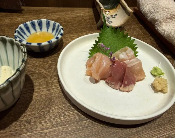私たちはお任せセットの前に店員さんにお勧めされ、鳥刺し3種盛りと、お豆腐にお塩を振りかけた前菜をいただきました。これがまた美味しい…!