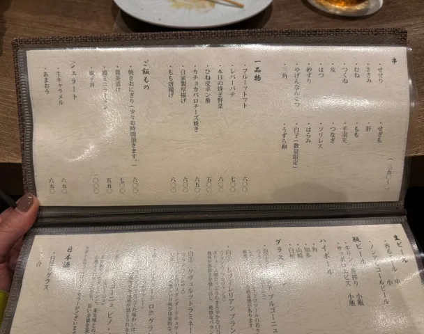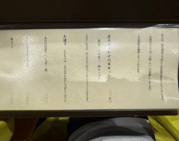 席に着き、メニューを広げて注文しようとすると、店員さんから「当店はまず、店主おまかせの6串セットからお願いしております」と説明が。その後、お腹の具合に合わせて好きな串や一品料理を追加していくスタイルだそうです。