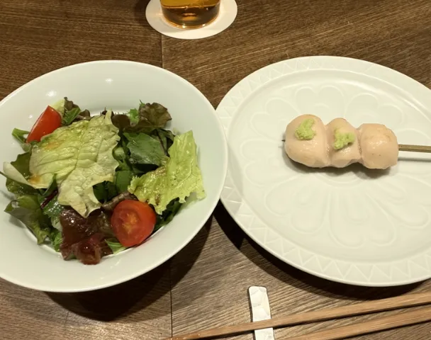 「こちらはささみです。中はレアに仕上げておりますので、わさびとご一緒にどうぞ」