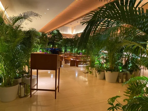 そこは、高い天井からたくさんの植物が吊り下げられた、まるで都会のジャングル!木の温もりと緑が融合した空間は、今までのホテルのイメージを覆す、不思議で心地よい空間でした。非日常への入り口は、ここから始まっていたんですね。