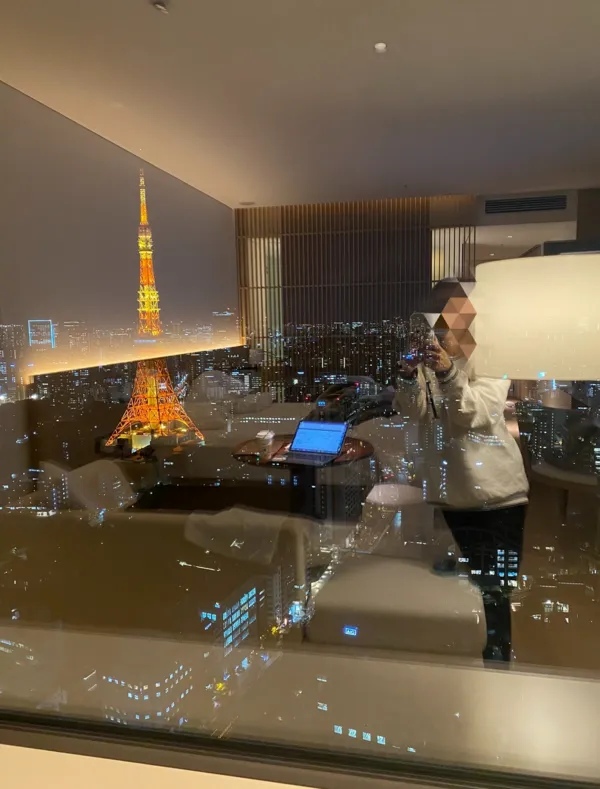 今回宿泊したのは、東京タワーが見えるお部屋。ドアを開けると、大きな窓の向こうに、あのオレンジ色のシンボルが!夜になると、ライトアップされた東京タワーがキラキラと輝き、ロマンチックな雰囲気に包まれます。この景色を眺めているだけで、最高の贅沢だと感じました。