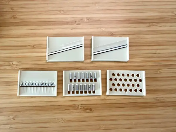 最大の特徴は、交換可能な5種類の刃が付属していること。これ一つで、日々の料理で必要とされるほとんどのカット作業をカバーできます。