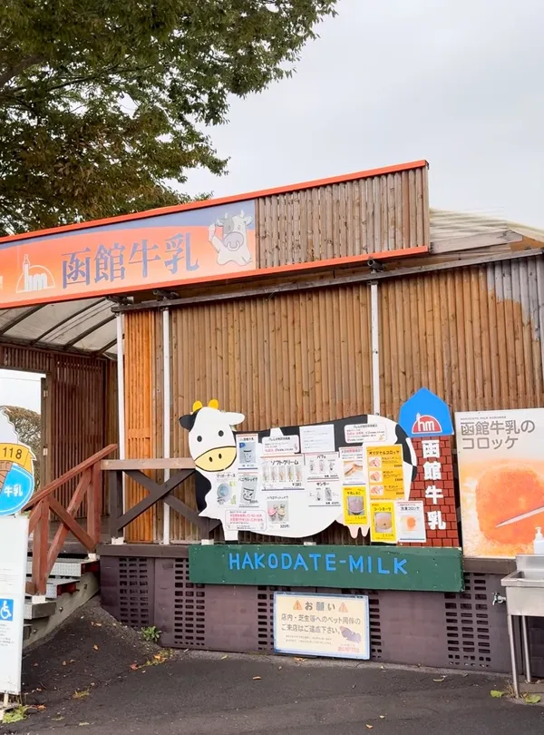 「あいす118」は、オレンジ色のパッケージでおなじみの「函館牛乳」を製造する函館酪農公社の工場敷地内にある直売店です。その名の通り、新鮮な牛乳をたっぷり使ったソフトクリームや乳製品が人気で、地元の人々はもちろん、多くの観光客で賑わうスポットです。