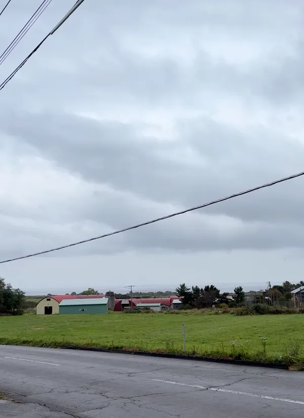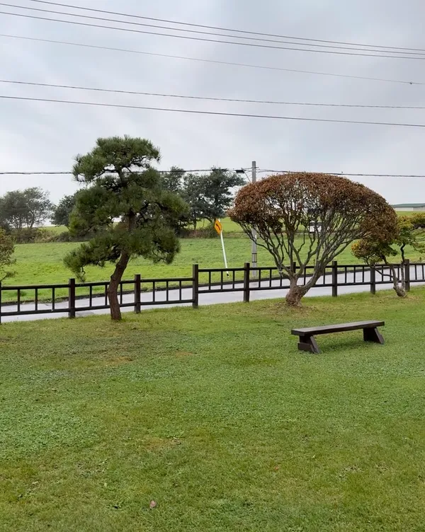 10月半ばの土曜日、午前11時頃に到着。函館空港から車を走らせること約5分、少し開けた山道を進むと、目的地が見えてきます。雨と低い雲が広がる空でしたが、目の前に現れた広大な牧草地には思わず息をのみました。
