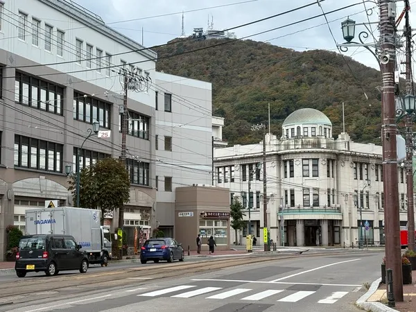 また、建物の向かい側から少し離れて見ると、背景の函館山とレトロな建物が一体となった、絵葉書のような美しい景色が広がります。絶好の写真撮影スポットなので、ぜひカメラを構えてみてください。