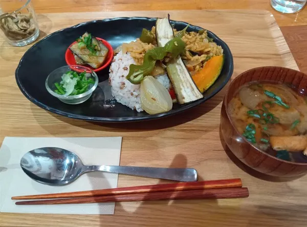 一口食べると、野菜の味が濃い!シャキシャキとした食感と、野菜本来の甘みや旨みが口いっぱいに広がります。鶏ひき肉と合わさったバジルの香りも爽やかで、どんどん食が進みました。添えられた黒塩をかけると、味がきゅっと引き締まり、また違った美味しさに。お味噌汁も出汁が効いていて、体にじんわりと染み渡るようでした。