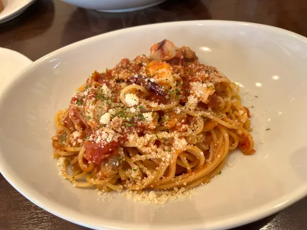 これが大正解!エビやアサリなどの魚介から出た旨味がトマトソースに溶け込んでいて、深いコクを感じられます。魚介の出汁が効いていて、思わずパンに付けて味わいたくなるほどでした。