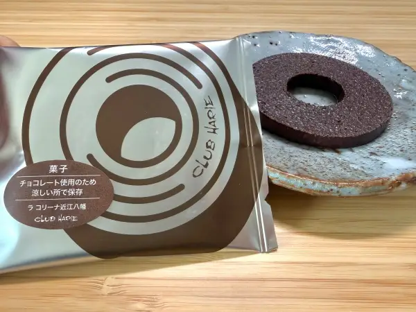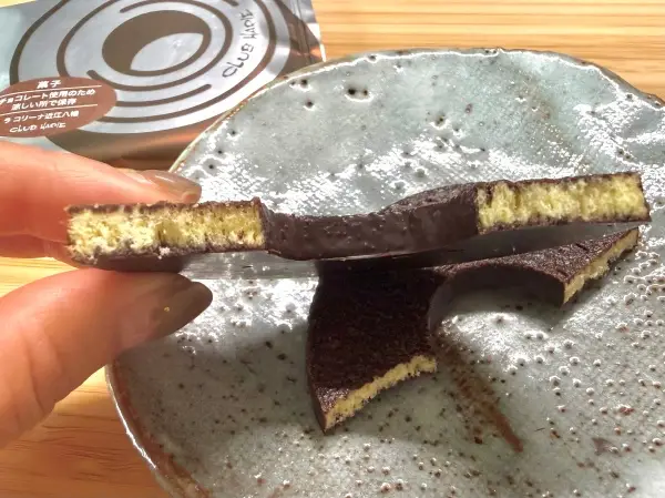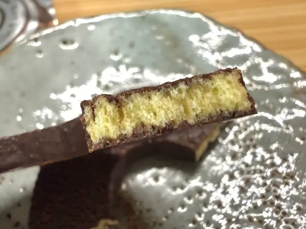 袋を開けた瞬間、ふわりとカカオの良い香りが!甘ったるい香りではなく、ビターで上品な香りです。見た目は、薄くスライスされたバームクーヘンがチョコレートで完全にコーティングされています。手のひらに乗るくらいの、ちょうど良いサイズ感です。