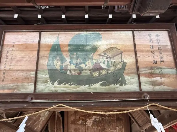 特に目を引くのが、鎖国時代に海外(安南=ベトナム)へ渡った商人が、帰国できぬまま故郷の当社に奉納したという「安南渡海之図」の舟絵馬。彼らの望郷の念と商売繁盛への祈りが込められています。