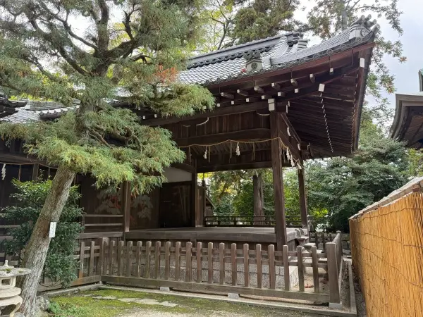 祭礼の際に神楽や舞が奉納される舞台。木々に囲まれた静かな佇まいです。