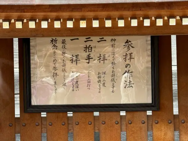 二礼二拍手一礼の作法が、美しい書で分かりやすく掲示されています。