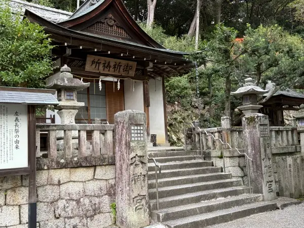 石段を上がり「御祈祷所」と書かれた建物へ。左には「左義長祭の由来」の看板も見えます。