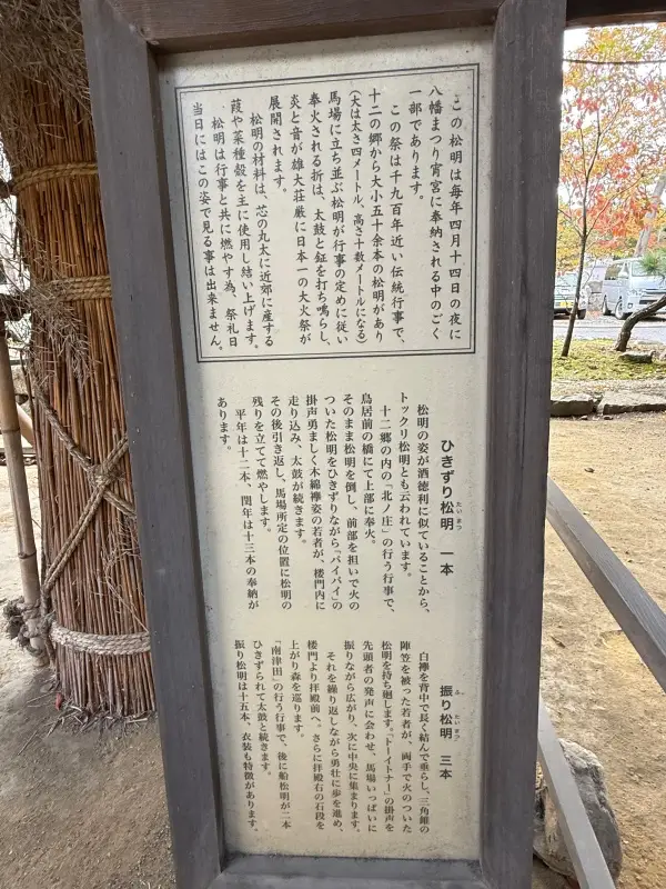 900年以上続く八幡まつりの歴史と、松明の形式について解説されています。