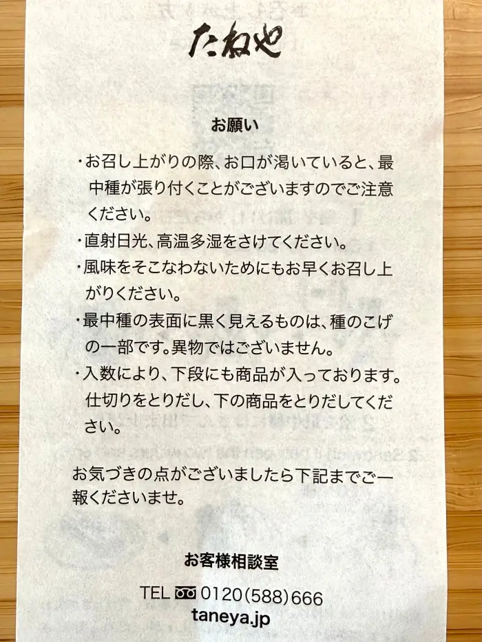 - 口の中にくっつく?:注意書きにもありますが、口の中が乾いている時に食べると、軽い最中種が上あごにくっつきやすいです。お茶と一緒にいただくのがおすすめです。