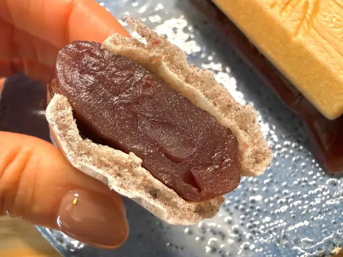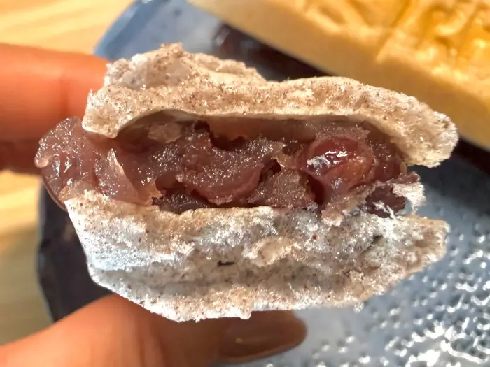 続いて、ベージュの「ふくみ天平」。こちらも皮のパリパリ感は健在です。しかし、食べ進めると現れるのが、もちっとした求肥。この食感が、素晴らしいアクセントになっています。