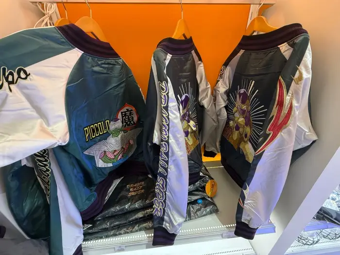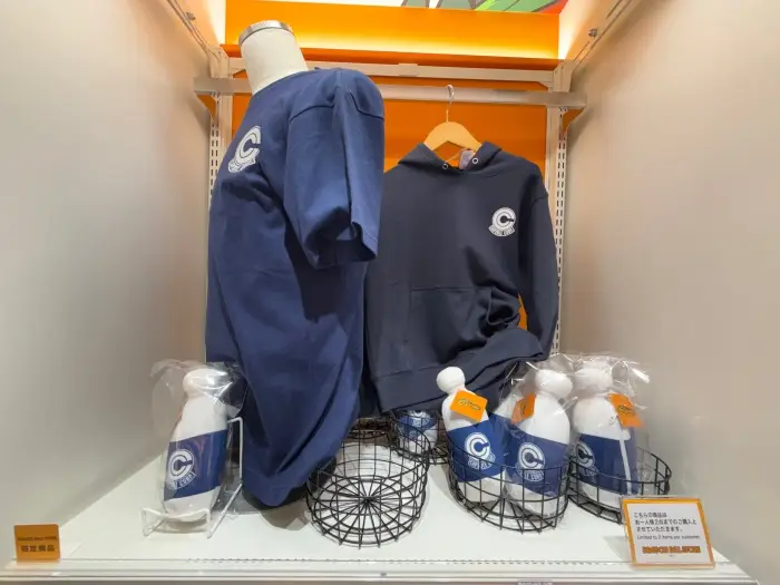 「限定商品」のラベルが付いたアイテムも多数ありました。カプセルコーポレーションのロゴが入ったパーカーや、キャラクターがデザインされたスカジャン、ぬいぐるみなど、ここでしか手に入らない特別なグッズが満載です。