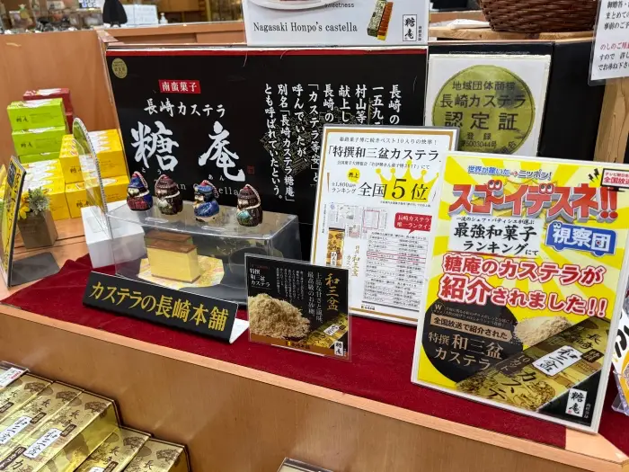 そして、長崎土産の王様「カステラ」も種類豊富。特に目を引いたのが、「糖庵」の特撰和三盆カステラ。なんでも、全国菓子大博覧会で売上ランキング全国5位に輝いた実力派なのだとか。シャリシャリ食感のザラメが特徴で、テレビでも紹介された人気商品だそうです。
