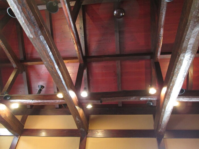 古民家ならではの落ち着いた雰囲気:高い天井とアンティーク家具が配された2階席は、非日常的で非常に落ち着く空間です。窓から見える緑も美しく、ゆったりと過ごしたい方には最適です。