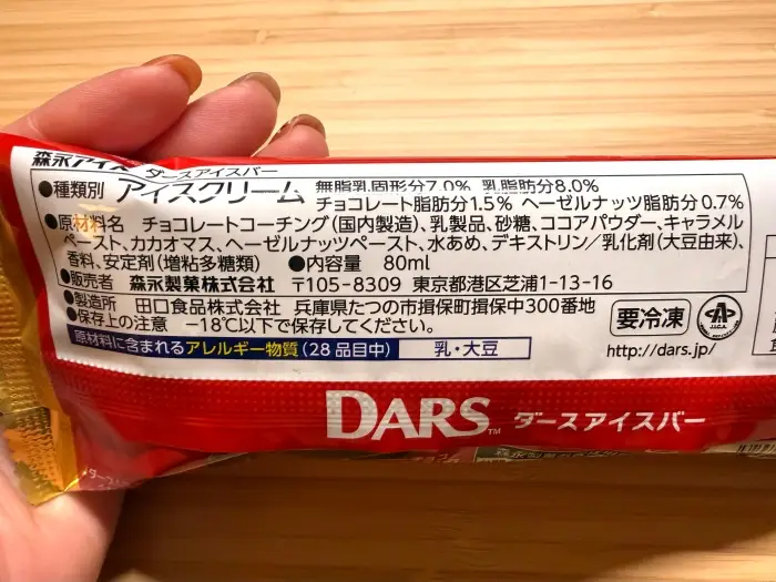 原材料名を見ると、チョコレートコーチングの次に乳製品、砂糖と続きます。また、キャラメルペーストやカカオマス、ヘーゼルナッツペーストなどが、あの複雑で奥深い味わいを生み出していることがわかりますね。アレルギー物質としては「乳・大豆」が含まれていますので、ご注意ください。