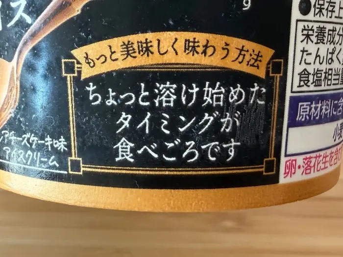 このアイス、ファミリーマート店頭の告知ボードでは「常温7分で美味しい食べごろ」との記載が書いてあって記憶に残っていました。