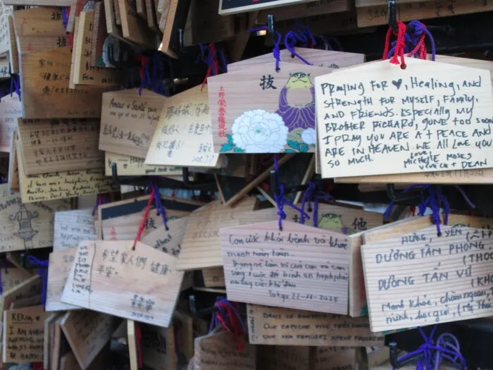 多くの人が集まる無料の拝殿前は、一番の賑わいを見せる場所。お参りをする人、写真を撮る人で活気に満ちています。絵馬掛所を覗くと、様々な言語で書かれた願い事がたくさん。世界中の人々がこの地で祈りを捧げていることが伝わってきます。