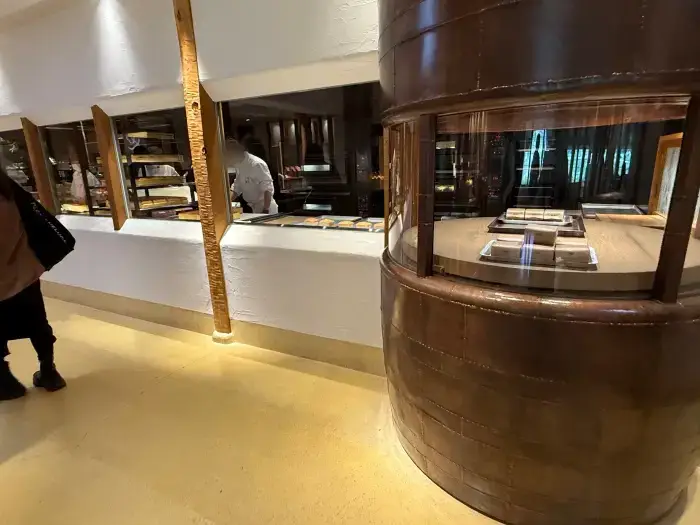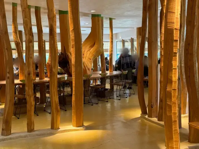 今回私はカフェには入りませんでしたが、ショップエリアからでもその素晴らしい雰囲気は十分に楽しめます。天井まで伸びる無数の栗の木を使った柱は圧巻で、自然の造形を活かしたデザインはどこを切り取っても絵になるんですよね。