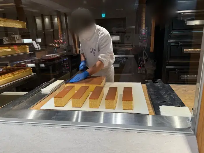「ガラス越しに職人さんがカステラをカットする様子が見られて、製造工程を見学できるのが良かったです。焼きたてのカステラは格別でした。」(食べログ)