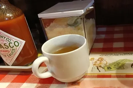 店内に入り、券売機で迷わず「白ナポ」を注文。カウンター席に座ると、目の前には様々な調味料がずらり。お水とスープはセルフサービスで、このコンソメスープがまた絶品!しっかりとした味で、これだけでも満足度が高いです。