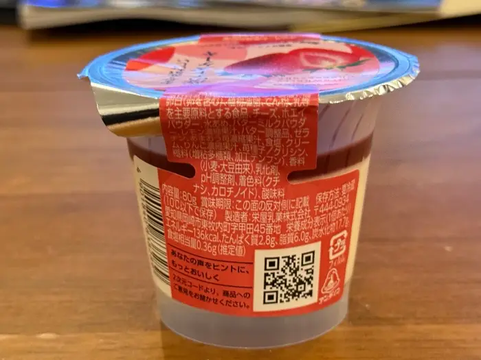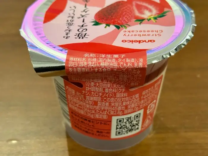 原材料名砂糖(国内製造、タイ製造)、液卵白(卵を含む)、植物油脂、でん粉、乳等を主要原料とする食品、チーズ、ホエイパウダー、バターミルクパウダー、レモン濃縮果汁、バター調整品、ゼラチン、あまおう苺濃縮果汁、食塩、クリーム、りんご濃縮果汁、苺種子など